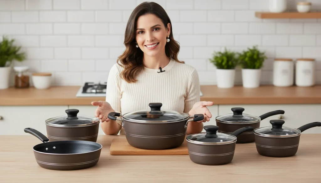 Os conjuntos geralmente incluem caçarolas de diferentes tamanhos, panelas, frigideiras, às vezes fervedores e até utensílios como colheres ou pegadores. O número de peças varia conforme o modelo e a marca.