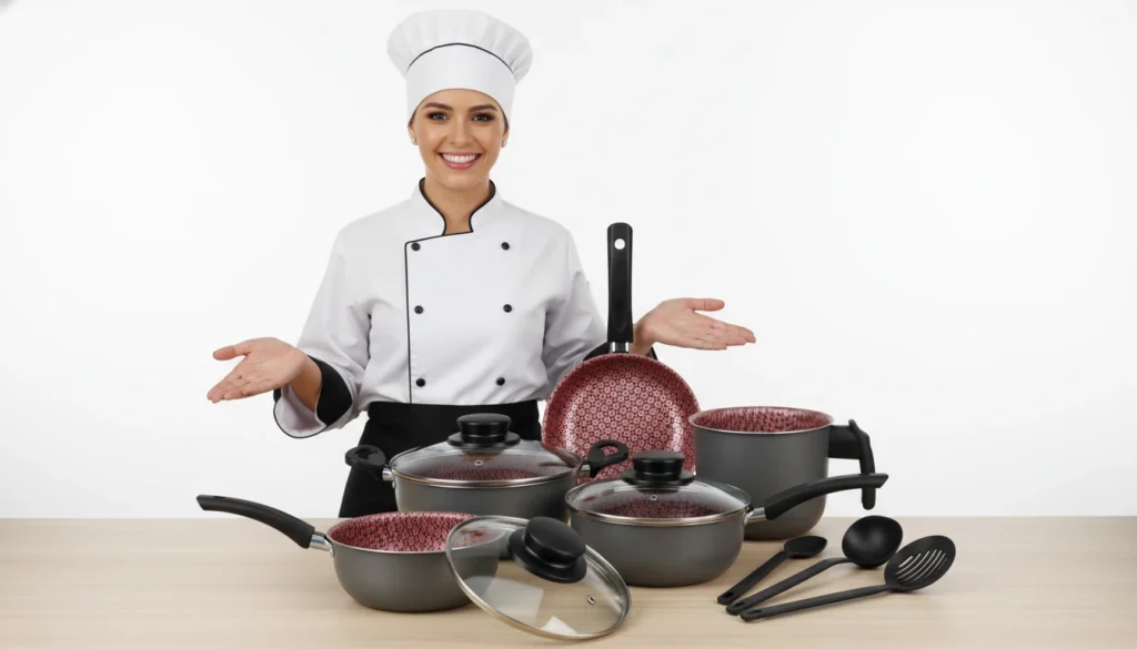 O ideal é compor um kit variado, com caçarolas, frigideiras, panelas e caldeirões em diferentes tamanhos, priorizando marcas reconhecidas pela qualidade e durabilidade, para atender a todas as demandas do cardápio.